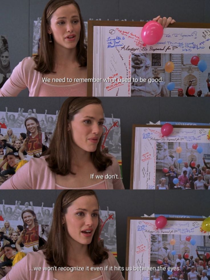 13 GOING ON 30 has a few laughs, and the love story is sweet and believable. The 13-year-old Jenna is disgusted by her 30-year-old self who sleeps around, cheats with a married man, drinks a lot, ignores anyone “beneath” her, and sells her magazine’s ideas to its competitor. What’s important is that Jenna wants to repair these sinful behaviors. She chooses what is good and true over what will bring her success, even if it means losing her dream job. The adult Jenna’s partying and live-in boyfriend will pose a problem for younger viewers. Overall, on the other hand, the story is warm and relates an important, positive lesson.