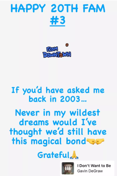 “Happy 20th Fam #3” he wrote in one post Saturday — which was soundtracked by One Tree Hill‘s theme song, “I Don’t Want to Be” by Gavin DeGraw — with a giph that said: “From Downtown.”