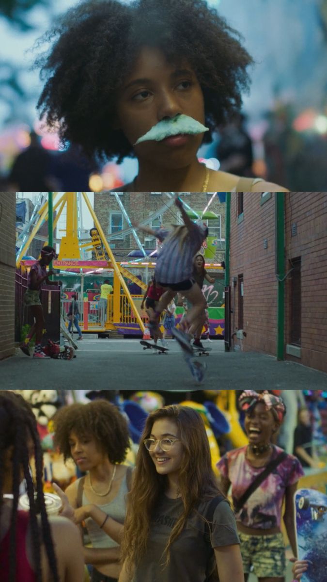 Figuring out whom she is as well as how to survive on her own, she and her friends wade through the tough times in life, including drug overdoses, injuries and the sting of betrayal. She begins a relationship with a fellow skater and co-worker Devon (Jaden Smith.) However, she finds out one of her skateboard friends, Janay, has had a previous relationship with Devon. Once Janay discovers she’s been skating with Devon and his friends, it severs her friendship with the group of girls, leaving Camille feeling hopeless and homeless. She rejoins Devon’s group but, eventually, apologizes and rejoins her girlfriends. Her relationship with both groups sheds a new perspective on love and helps her understand what love and community really mean.